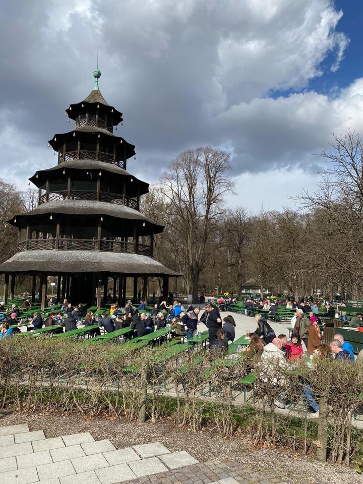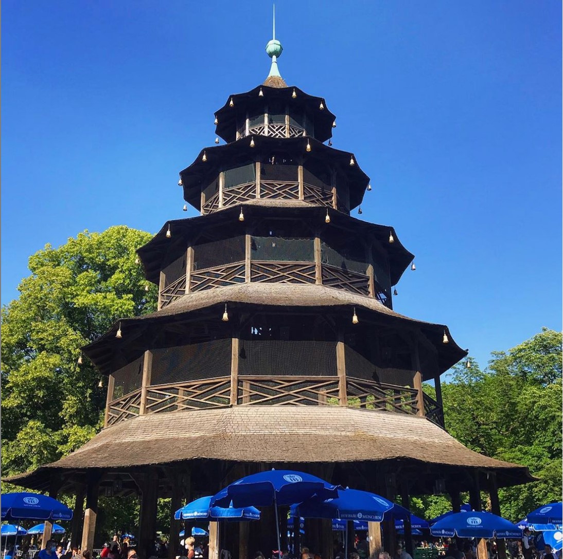 Chinese Tower restaurant and beer garden consist of benches spread out around a five-story faux Chinese pavilion.